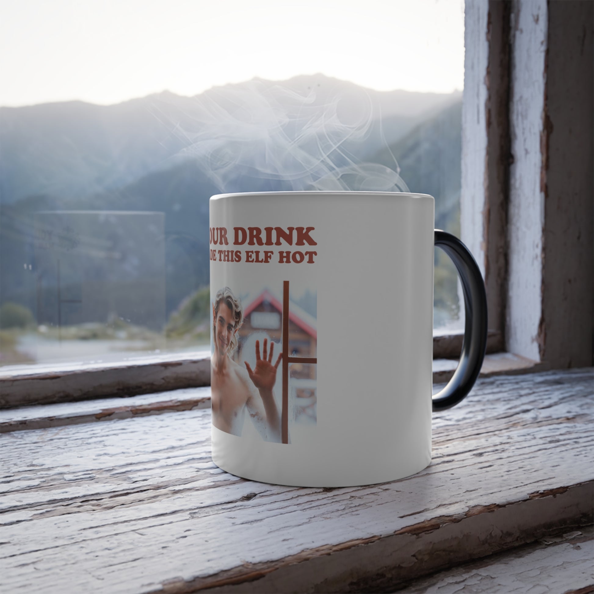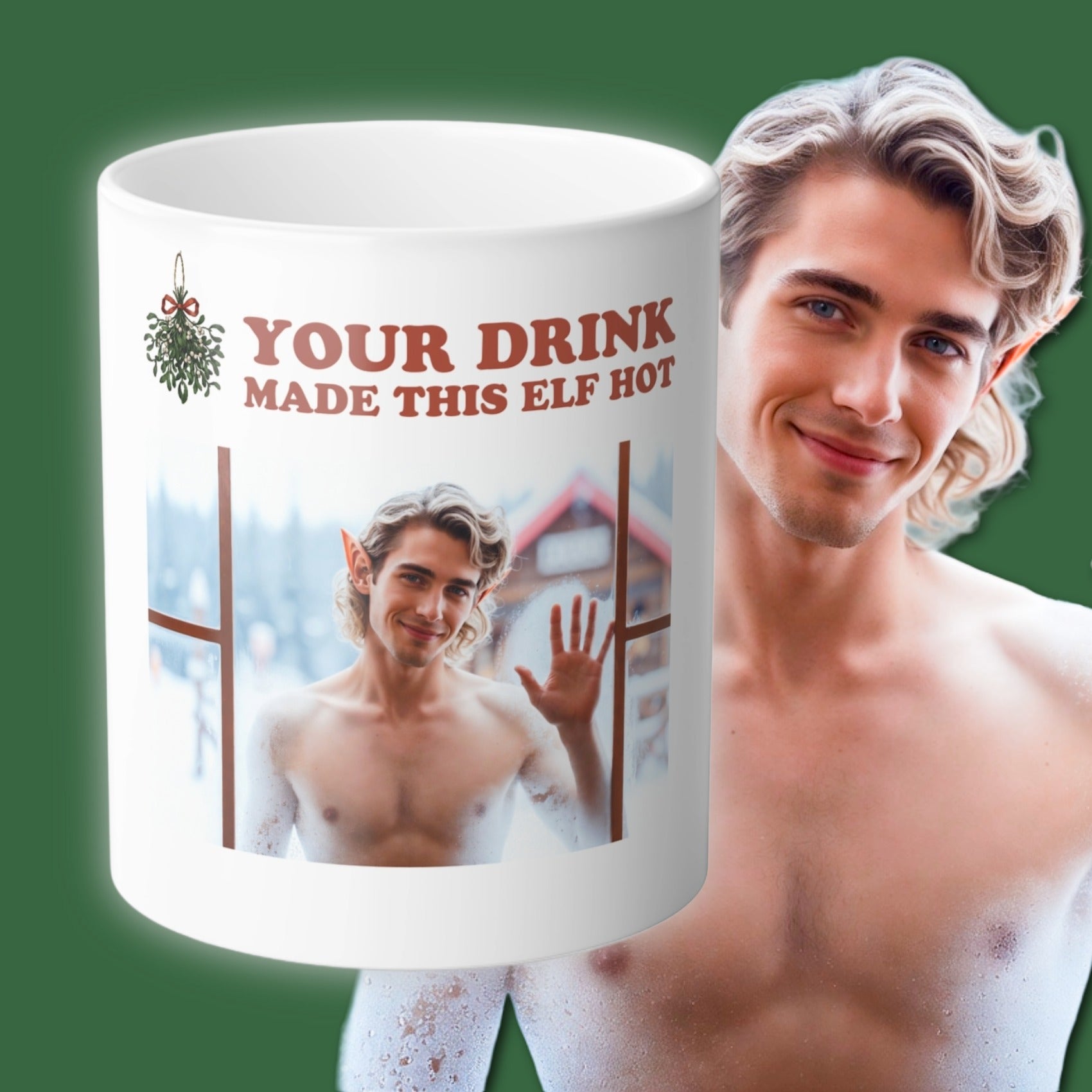 Pour in a hot drink and the black coating fades away, revealing a shirtless Christmas elf at the window and the line “Your drink made this elf hot.”
